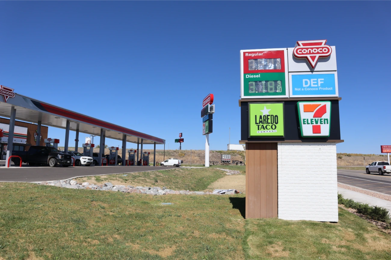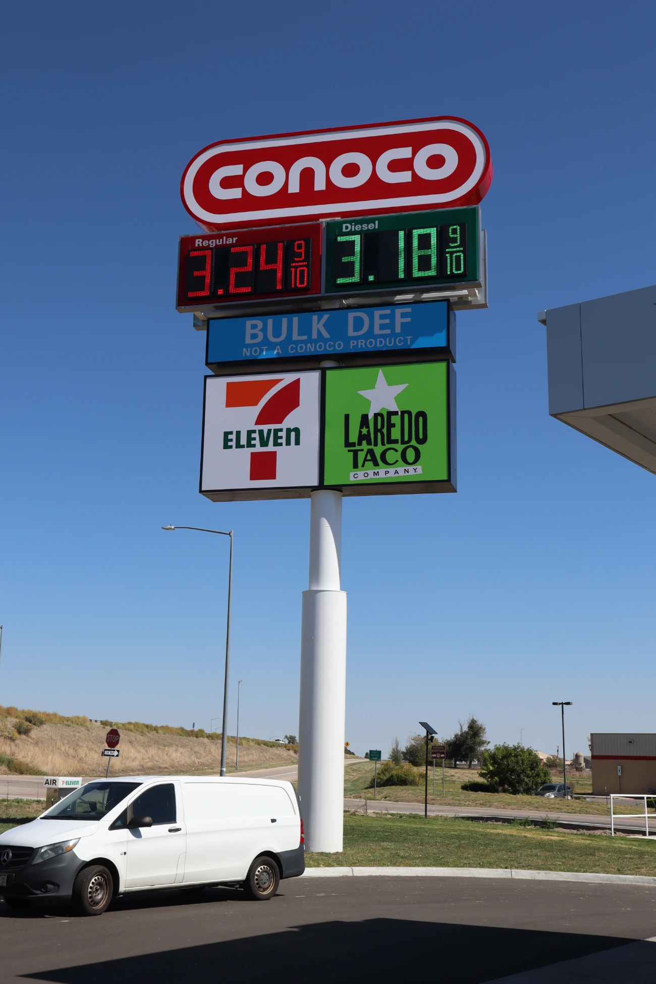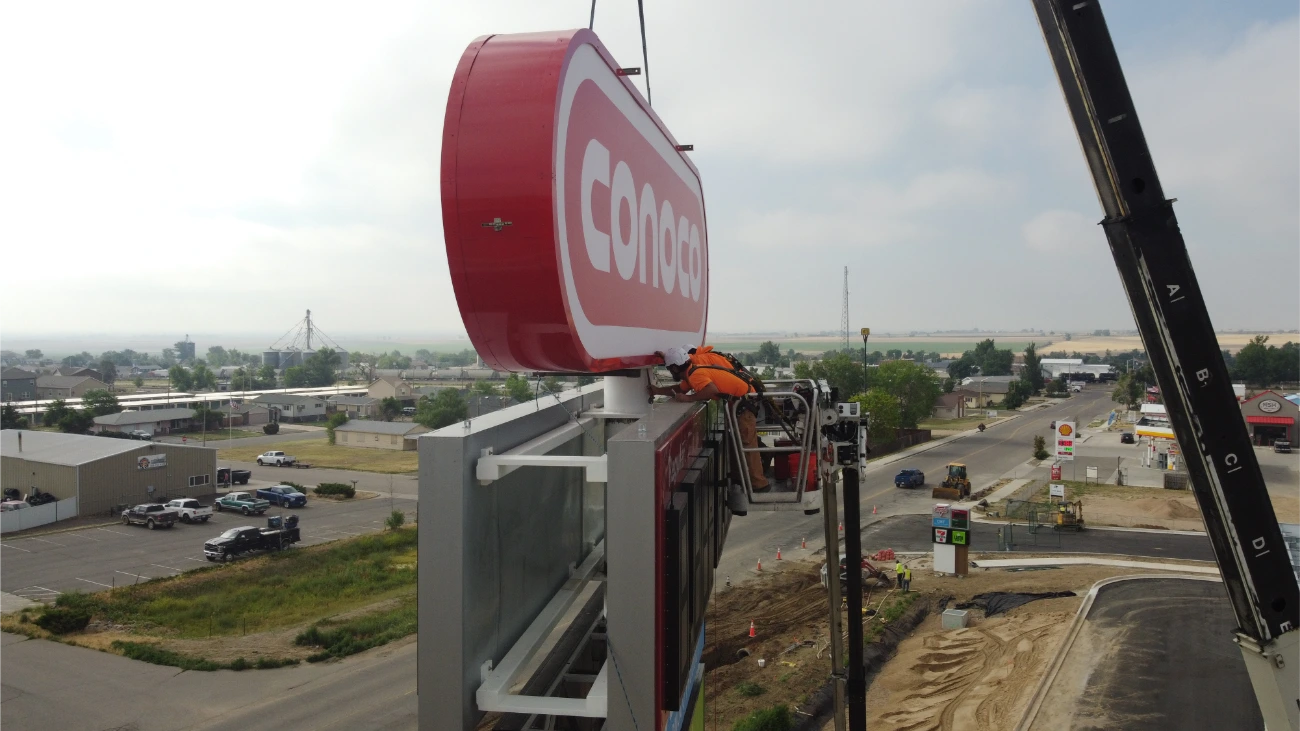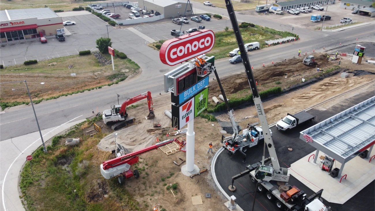 The Keenesburg project covered everything from front-lit pan channel letters on the building and gas canopy to clear directional signs and two large ground signs with digital displays that increase visibility and provide dynamic messaging for passing traffic. The most demanding part of this project was installing the massive 60-foot ground sign, which required thorough planning, specialized equipment, and multiple site visits. Our team used heavy equipment, including off-loaders to transport the large poles and a 60-ton crane truck to lift and securely install the sign.
