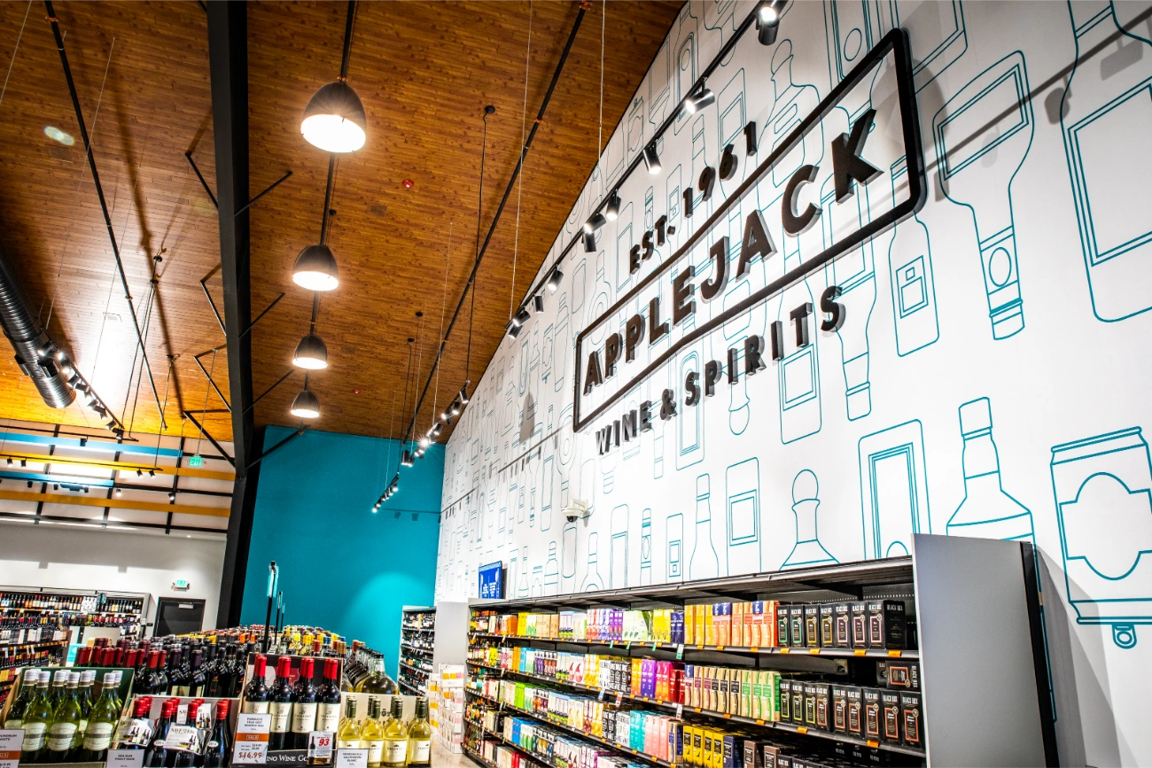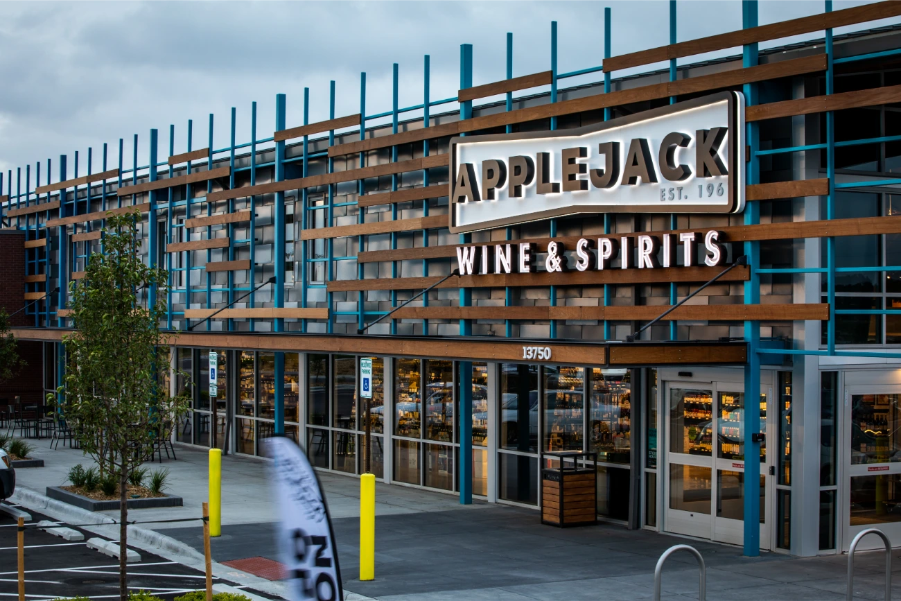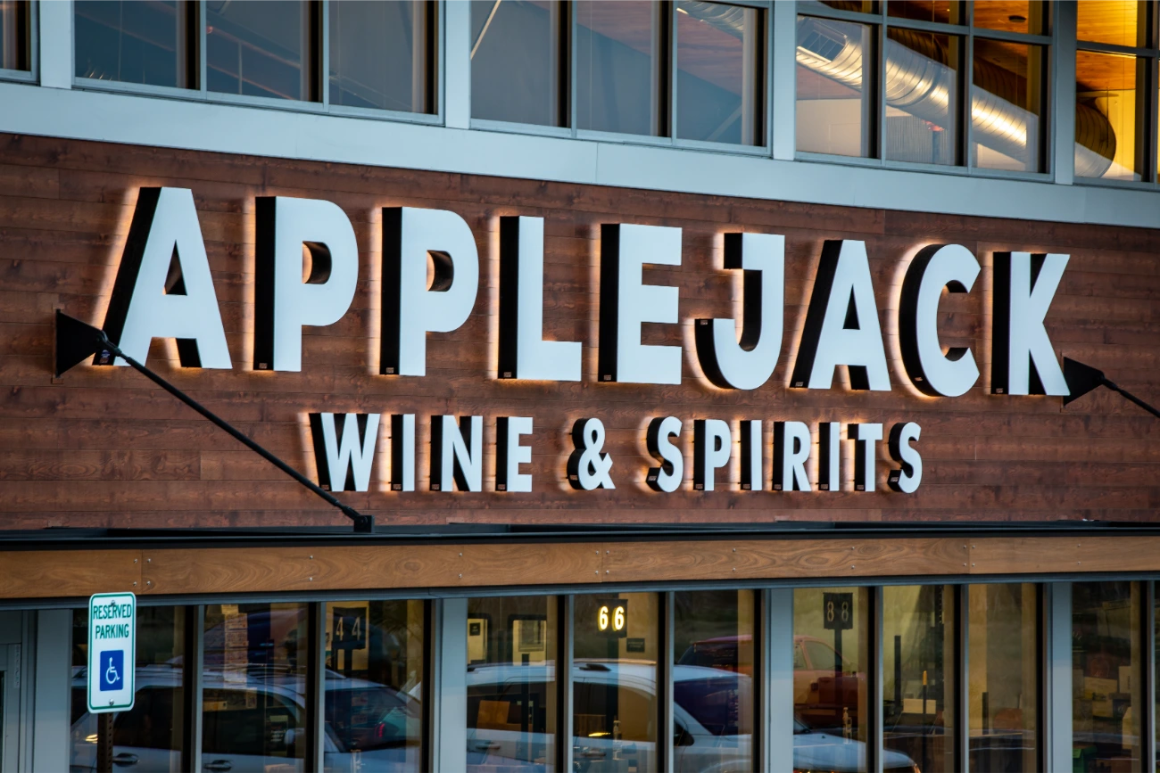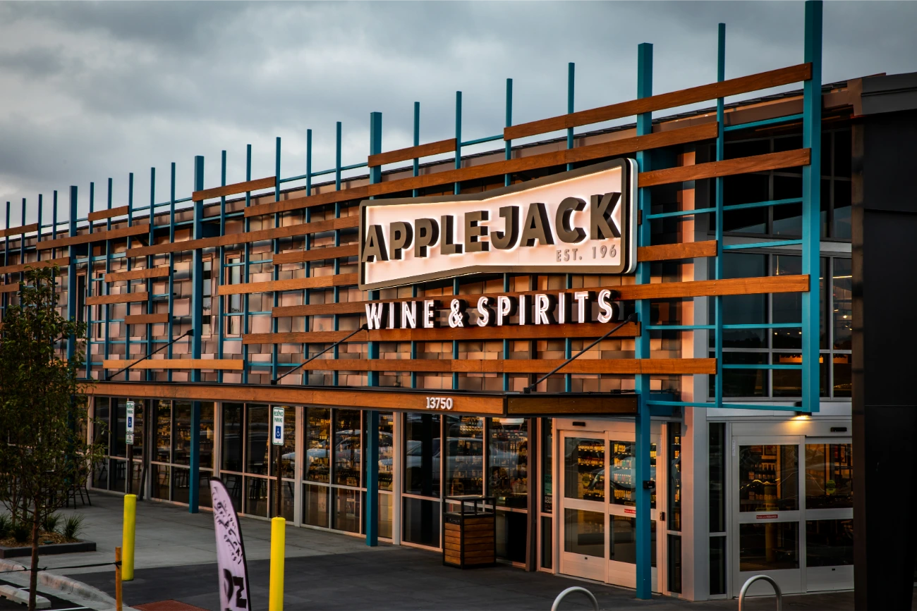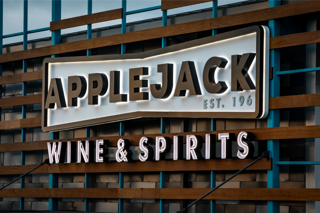 In their expansion towards the northern Denver region, Apple Jack Wine & Spirits reached out to BSC for assistance in establishing a fresh and distinctive signage. Having been founded in 1961, Apple Jacks already possessed a strong brand identity that perfectly complemented their new location. Collaborating closely with the BSC team, two expansive reverse-lit pan channel exterior signs were conceived and brought to life. Our team additionally created a vintage yet contemporary blade sign, serving as a guide for customers. In addition to the array of exterior signage, BSC also took part in the creation and installation of interior signage, ranging from FCO wall signs to comprehensive wall graphics. This balanced fusion of classical and modern design elements significantly contributed to elevating the overall building ambiance.