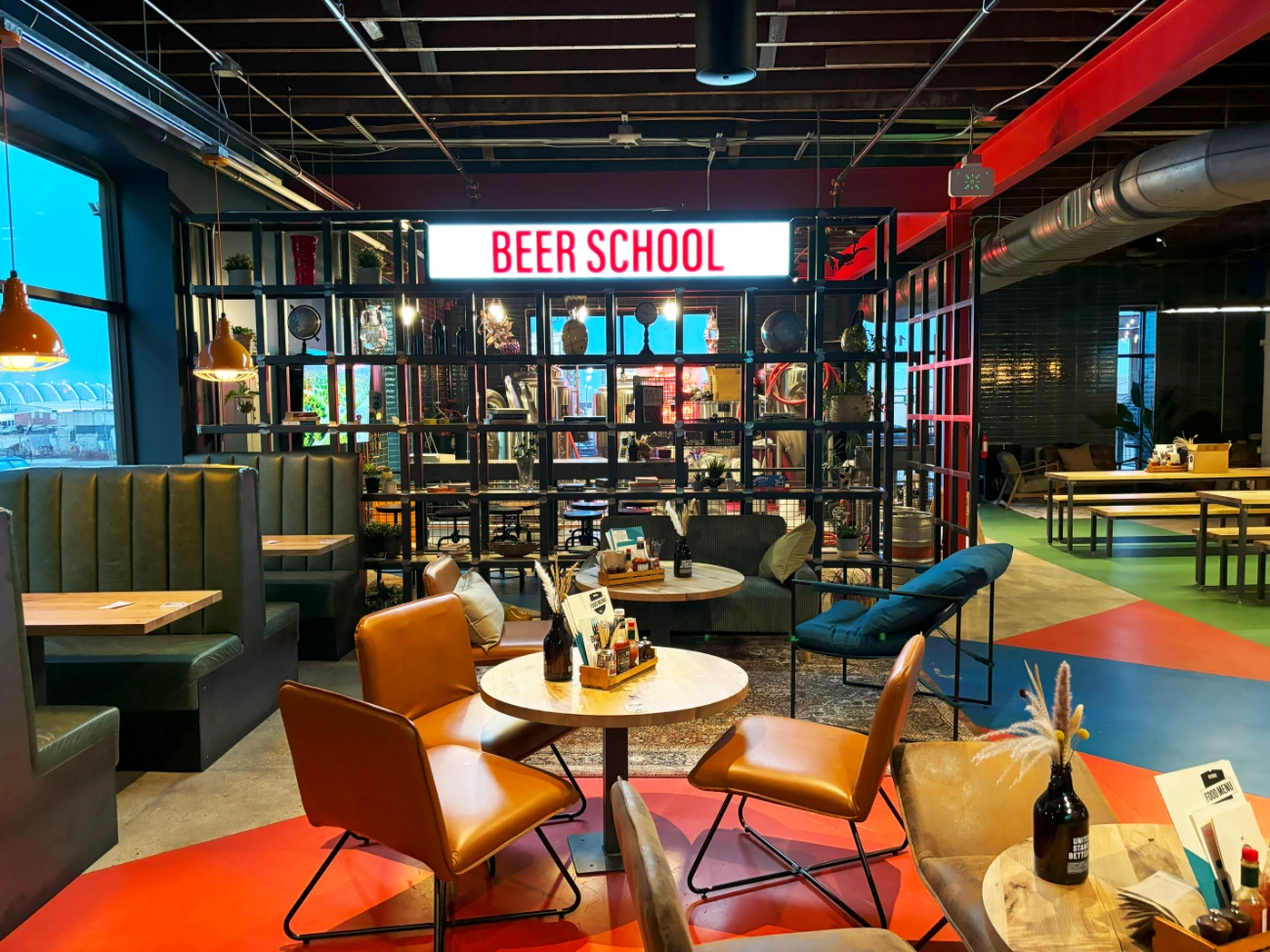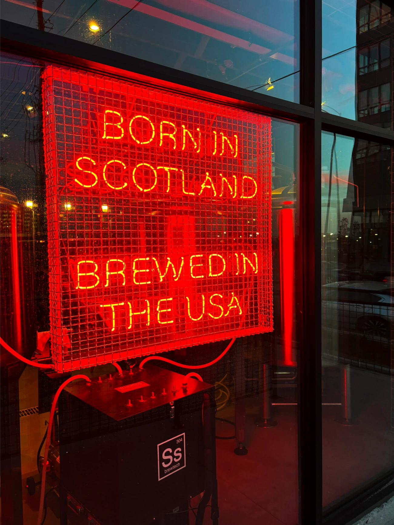 neon signage, including the standout “Born in Scotland, Brewed in the USA” sign, which adds an energetic and immersive touch to the brewery’s atmosphere. Additional branded elements, including directional and decorative signage, create a seamless look that ties the space together. This project showcases BSC Signs’ expertise in crafting high-quality, eye-catching signage for breweries and restaurants, helping brands make a lasting impression