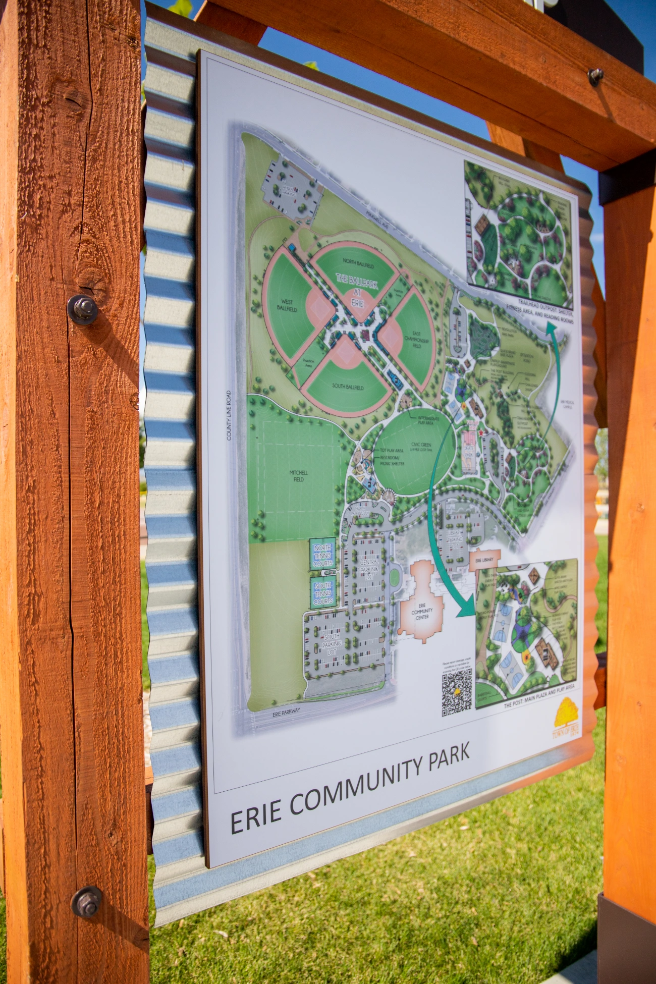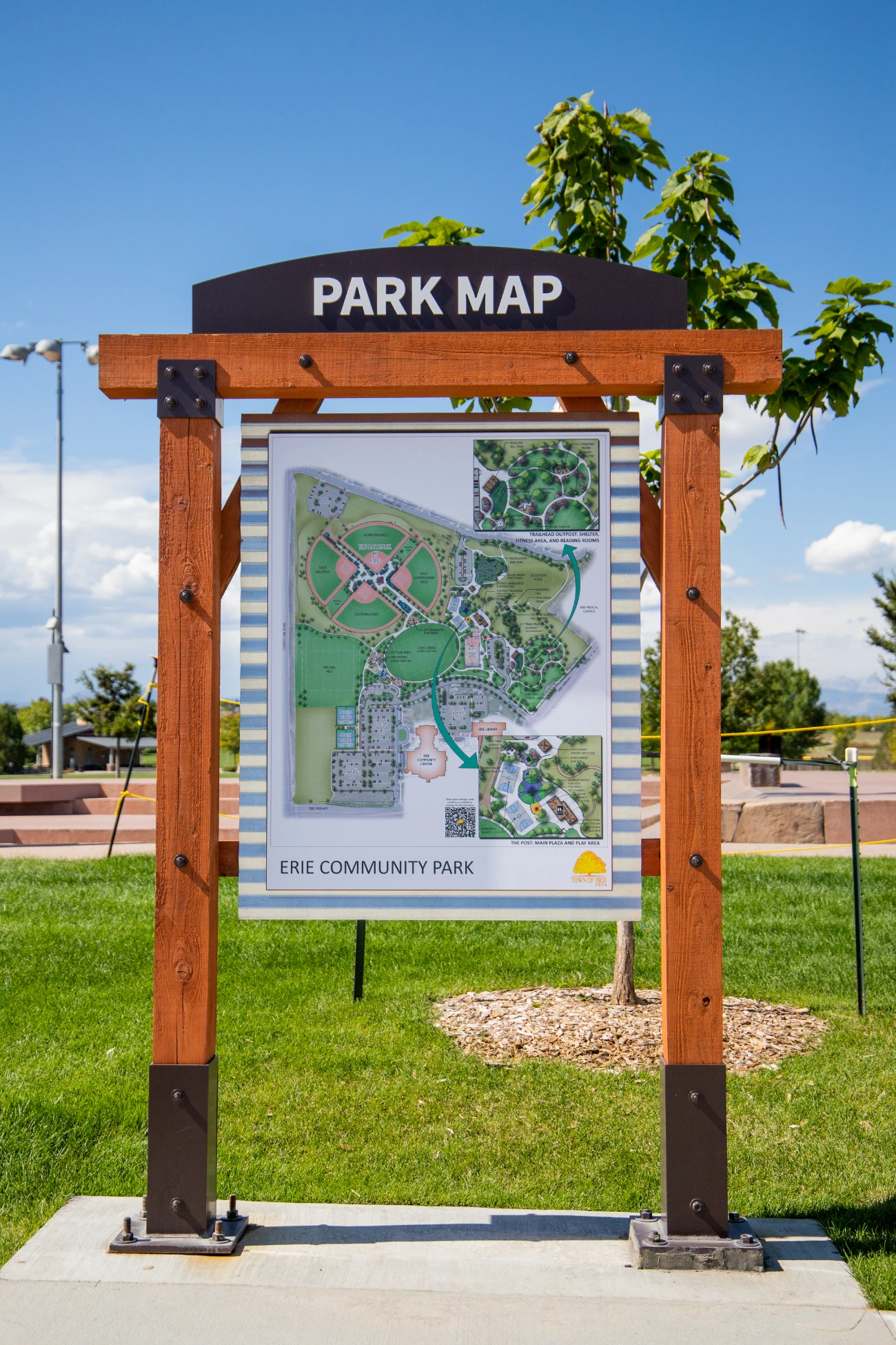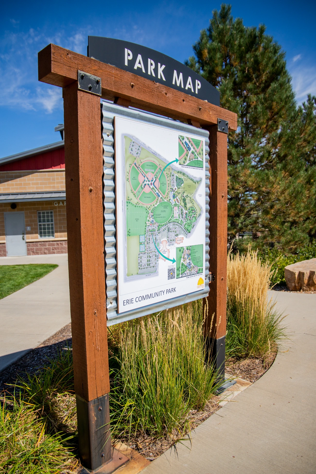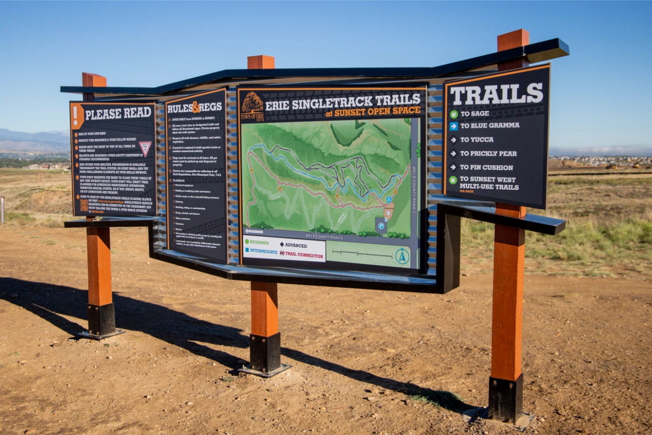 The project at Town of Erie Community Park spans 49.3 acres and required a comprehensive and cohesive approach to signage to ensure visitors could easily navigate its vast area. BSC collaborated closely with the Town of Erie to understand their needs and vision, resulting in a series of directional signs and free-standing signs that are both functional and visually appealing.