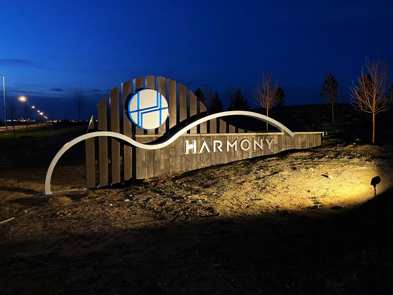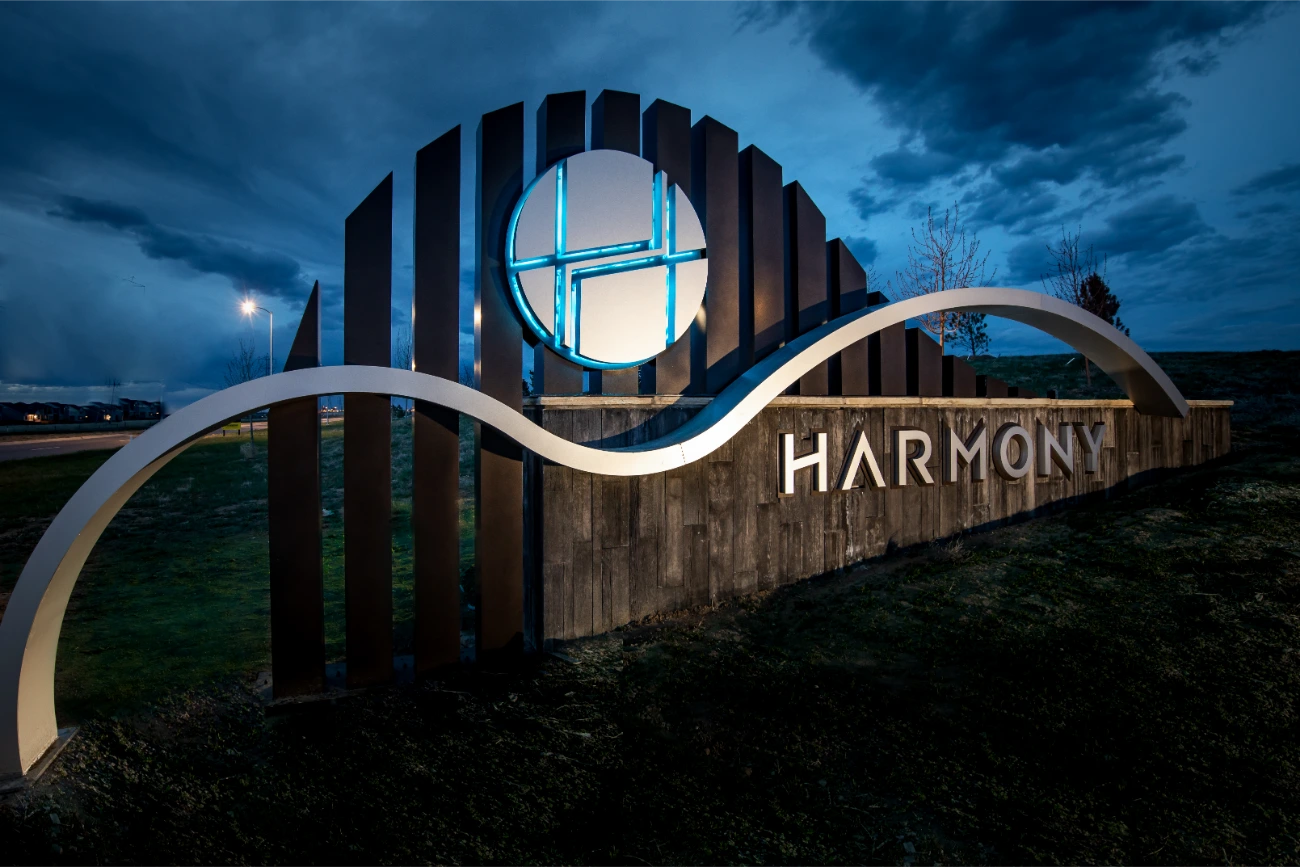 BSC Signs has been a proud partner with Groundworks Development since 2019, helping bring their vision for the Harmony community in Aurora, Colorado to life. This ongoing collaboration has resulted in the creation of large, eye-catching entry monument signs that welcome visitors with a blend of art structure elements and impressive design. The freestanding monument signs feature stone veneer, pan channel letters, and RGB LED lighting that illuminates the Harmony logos, providing a striking and modern visual both day and night.