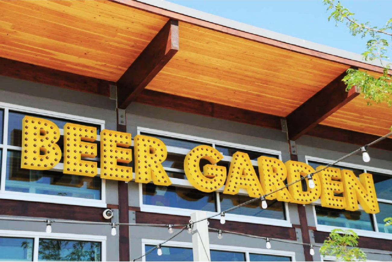 The GVR Beer Garden is situated within its own charming park, boasting over 4,500 square feet of outdoor garden space. In collaboration with Larimer Associates, BSC Signs crafted signage that perfectly captured the welcoming ambiance of the Beer Garden. They designed a modern yet vintage-inspired style, featuring open-faced pan channels illuminated by an array of bulbs. This signage not only brightens up the area but also fosters a strong connection with the local community.