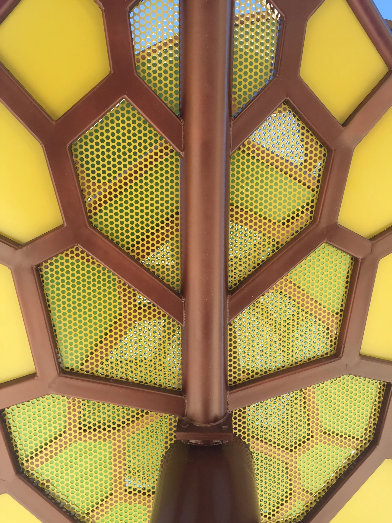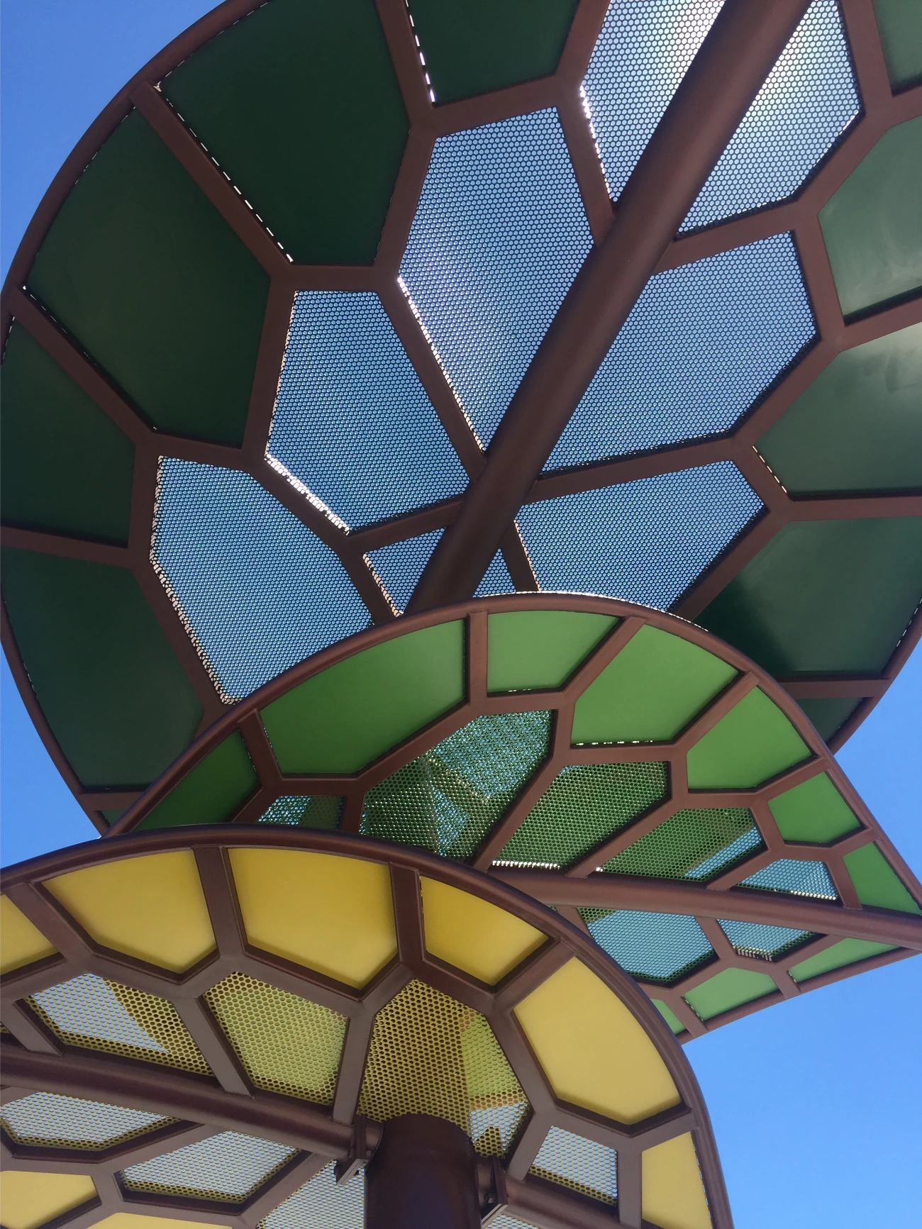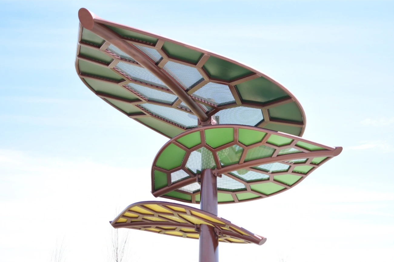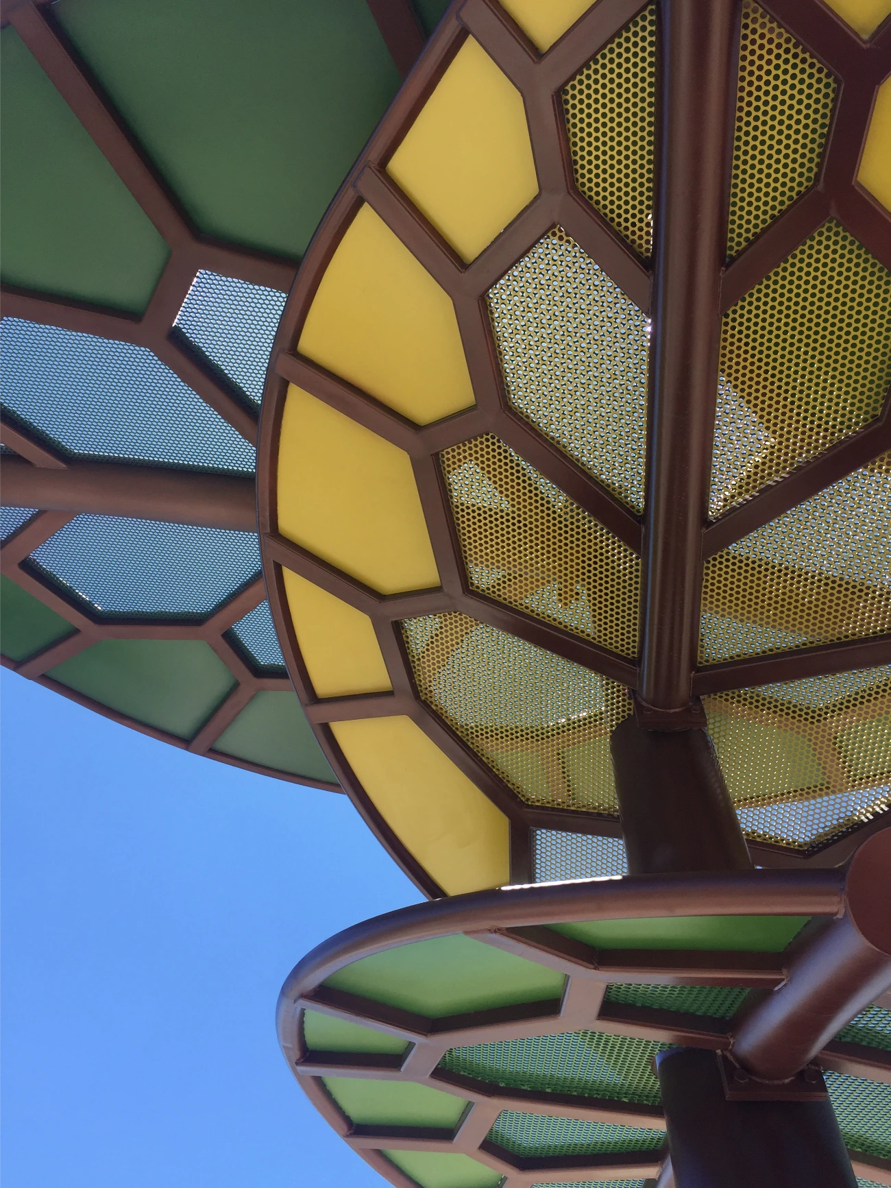 Working alongside the architect & structural engineer, we used detailed 3D models to fabricate these striking sculptures. Each 24-foot central pole supports three curved steel mesh “leaves,” the largest measuring 27 by 18 feet with natural painted finishes and perforated metal centers. To accommodate transportation, the largest leaves were built in two pieces to fit under highway overpasses and clear other obstacles.