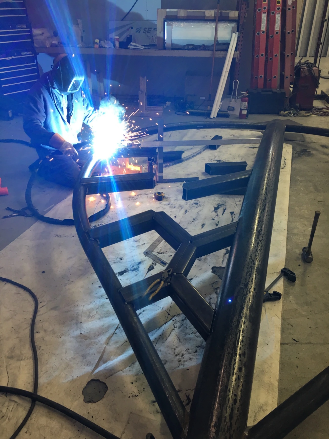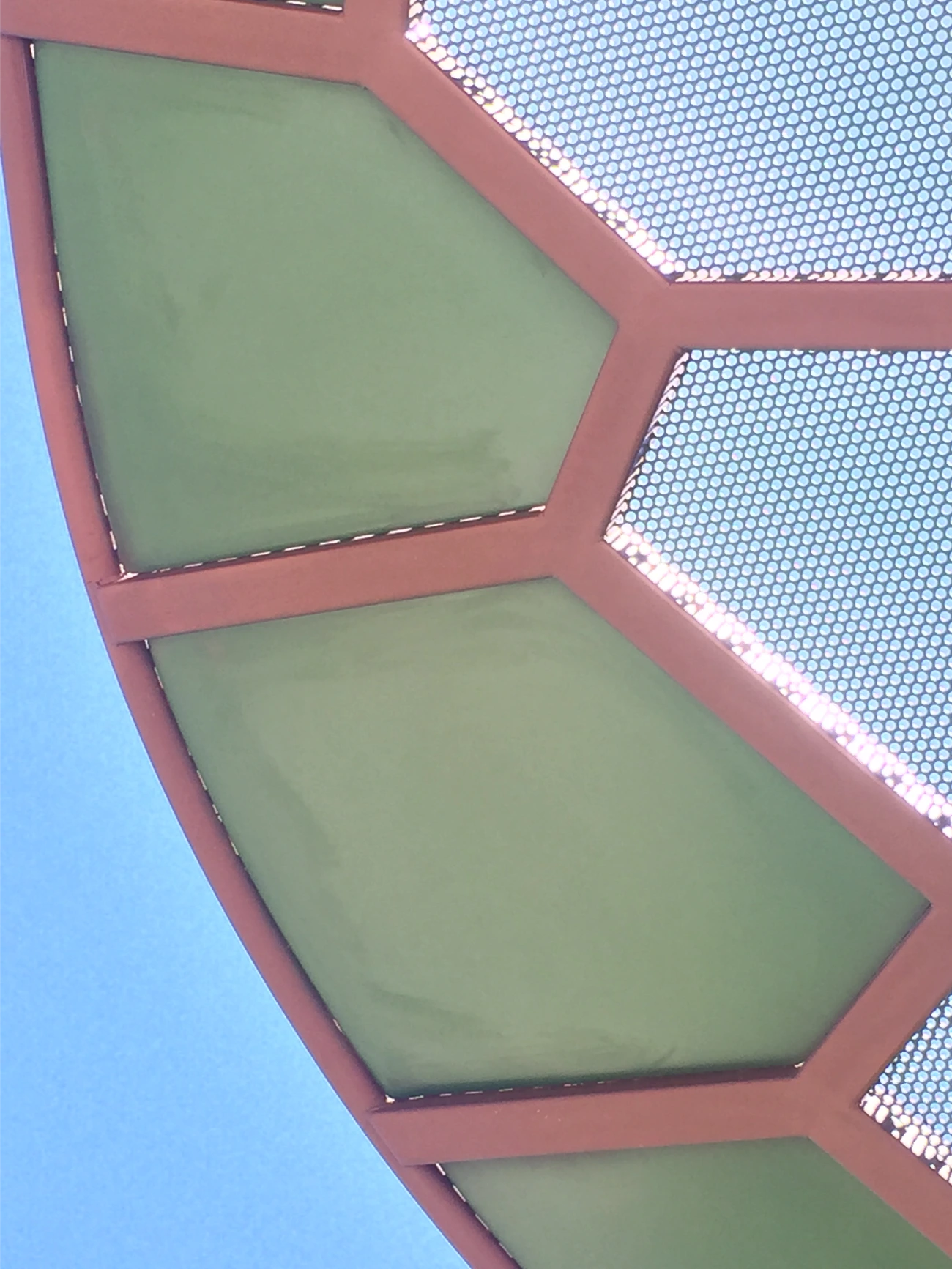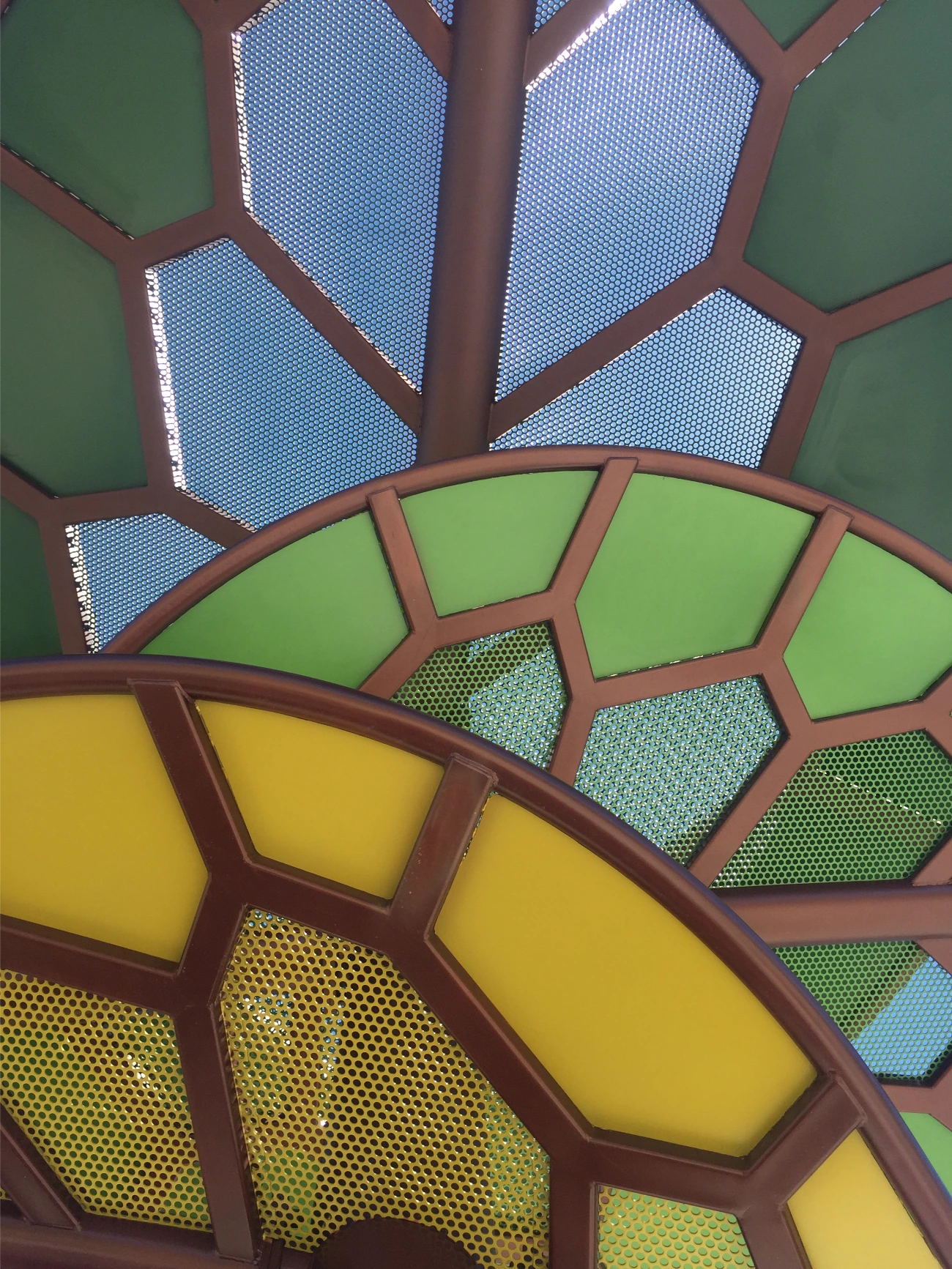Working alongside the architect & structural engineer, we used detailed 3D models to fabricate these striking sculptures. Each 24-foot central pole supports three curved steel mesh “leaves,” the largest measuring 27 by 18 feet with natural painted finishes and perforated metal centers. To accommodate transportation, the largest leaves were built in two pieces to fit under highway overpasses and clear other obstacles.
